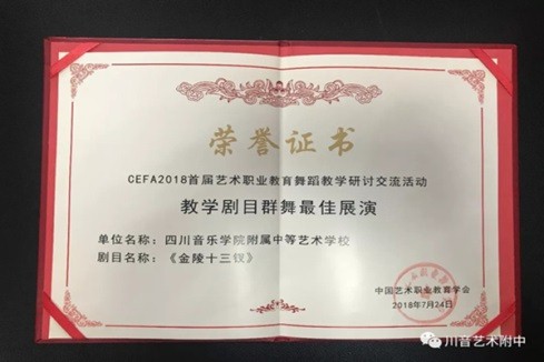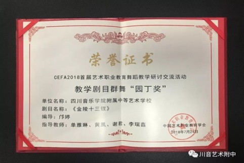 2018年7月24日,伟德官网艺术附中群舞剧目《金陵十三钗》在由“中国艺术职业教育学会”主办的CEFA2018首届艺术职业教育舞蹈教学研讨交流活动暨“芳华杯”大赛中,经过激烈的角逐,一路过关斩将,最终荣获总决赛“最佳展演奖”。该剧编导邝婷老师,指导教师黄凰、单雅琳、谢君、李瑞鑫获得教学剧目群舞“园丁奖”。