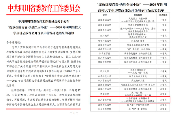 在中共四川省委教育工委组织的“绽放抗疫青春•决胜全面小康”——2020年四川高校大学生讲思政课公开课展示作品征集和评选活动中,由马克思主义学院教师指导、国际演艺学院学生王淼讲授的思政公开课《以吾辈青春 护锦绣中华——以爱国主义为核心的民族精神》,在全省近百部作品中脱颖而出,荣获二等奖。