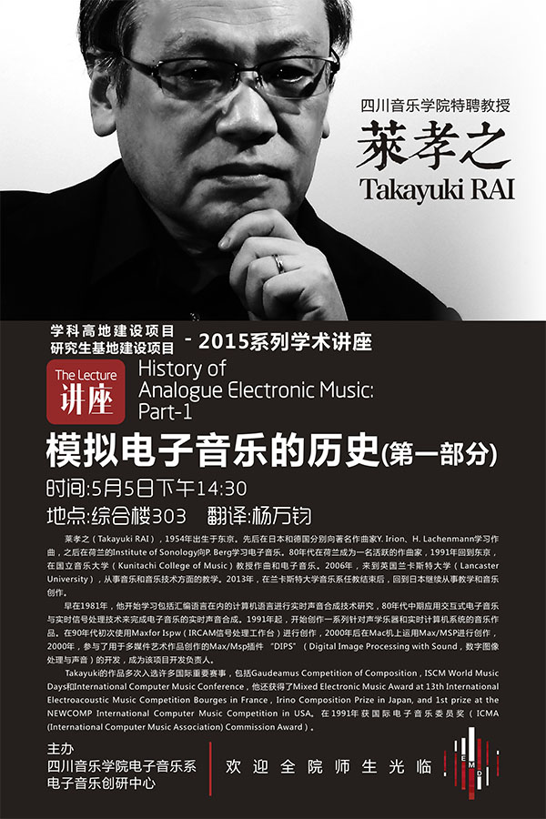 讲座题目:《模拟电子音乐的历史(第一部分)》     主讲人:莱孝之     时间:2015年5月5日14点30分     地点:综合楼303室