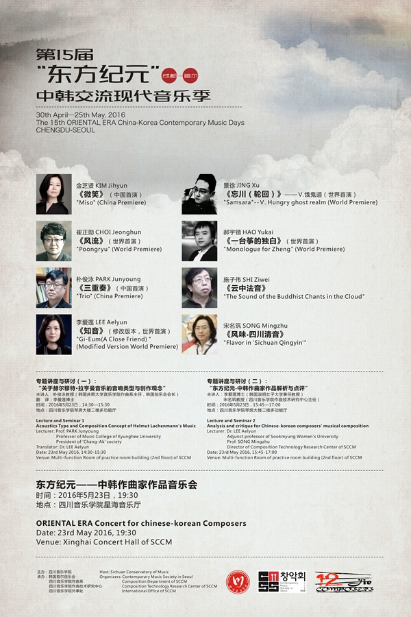 第15届“东方纪元”——中韩交流现代音乐季 金芝贤 KIM Jihyun 《微笑》 (中国首演) "Miso" (China Premiere) 景徐 JING Xu 《忘川(轮回)》——Ⅴ.饿鬼道(世界首演) "Samsara"--Ⅴ. Hungry ghost realm (World Premiere) 崔正勋 CHOI Jeonghun 《风流》(世界首演) "Poongryu" (World Premiere) 郝宇锴 HAO Yukai 《一台筝的独白》(世界首演) "Monologue for Zheng" (World Premiere) 施子伟 SHI Ziwei 《云中法音》 "The Sound of the Buddhist Chants in the Cloud" 朴俊泳 PARK Junyoung 《三重奏》(中国首演) "Trio" (China Premiere) 宋名筑 SONG Mingzhu 《风味•四川清音》 "Flavor in ‘Sichuan Qingyin’" 李爱莲 LEE Aelyun 《知音》(修改版本,世界首演) "Gi-Eum(A Close Friend) " (Modified Version World Premiere)  专题讲座与研讨(一): “关于赫尔穆特•拉亨曼音乐的音响类型与创作观念” 主讲人:朴俊泳教授(韩国庆熙大学音乐学院作曲系主任,韩国创乐会会长) 翻 译:李爱莲博士 时间:2016年5月23日,14:30—15:30 地点:伟德bv国际体育琴房大楼二楼多功能厅  专题讲座与研讨(二): “东方纪元-中韩作曲家作品解析与点评” 主讲人:李爱莲博士(韩国淑明女子大学兼任教授) 宋名筑教授(伟德bv国际体育作曲技术研究中心主任) 时间:2016年5月23日,15:45—17:00 地点:伟德bv国际体育琴房大楼二楼多功能厅  东方纪元——中韩作曲家作品音乐会 时间:2016年5月23日,19:30 地点:伟德bv国际体育星海音乐厅 主办:伟德bv国际体育 承办:韩国首尔创乐会 伟德bv国际体育作曲系 伟德bv国际体育作曲技术研究中心 伟德bv国际体育外事处