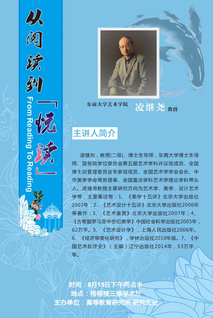 时间:6月15日下午两点半 地点:梧桐楼三楼学术厅 主题:从阅读到“悦读” 主讲人:东南大学艺术学院凌继尧教授 主办单位:高等教育研究所 研究生处 主讲人简介:凌继尧,教授(二级)、博士生导师,东南大学博士生导师、国务院学位委员会第五届艺术学科评议组成员、全国博士后管理委员会专家组成员、全国艺术学学会会长、中华美学学会常务理事、全国重点学科艺术学理论学科带头人。凌继尧教授主要研究方向为艺术学、美学、设计艺术学等,主要著述有:1、《美学十五讲》北京大学出版社2003年;2、《艺术设计十五讲》北京大学出版社2006年等著作;3、《艺术鉴赏》北京大学出版社2007年;4、《古希腊罗马至中世纪美学》中国社会科学出版社2005年,62万字。5、《艺术设计学》,上海人民出版社2006年。6、《经济审美化研究》,学林出版社2010年版。7、中国艺术批评史(主编)辽宁出版社2014年,53万字。等