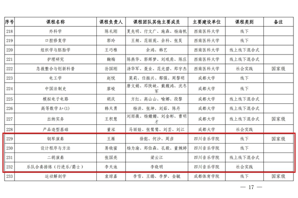 1.国家级、省级一流本科课程(线下):钢琴系《钢琴演奏》(负责人:王雁,团队成员:徐懿、何沙、周彦)