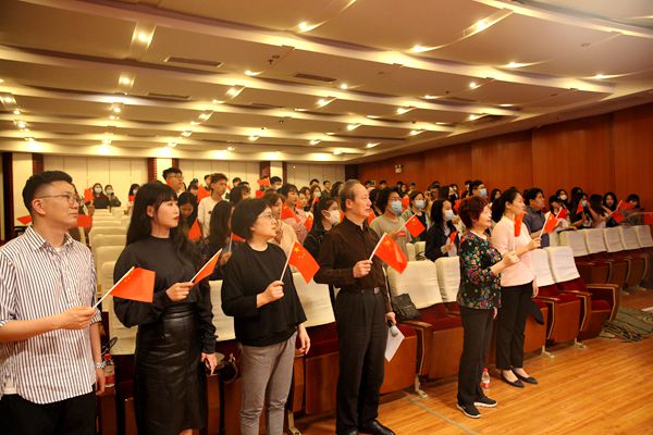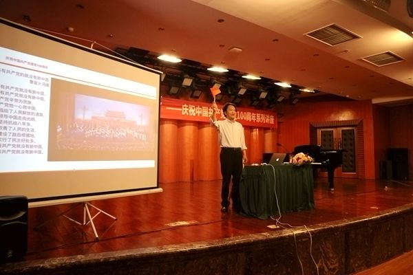 最后,全场观众起立,在敖昌群教授指挥下,大家同时挥舞着手中的五星红旗齐声高唱《没有共产党就没有新中国》,在高亢嘹亮的歌声中结束了本次讲座。