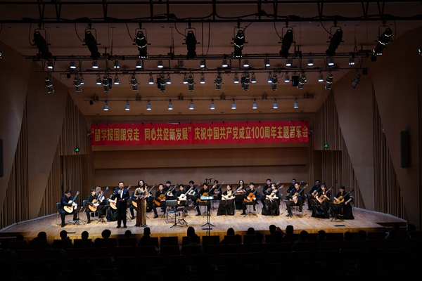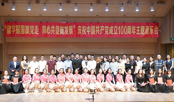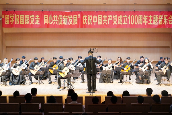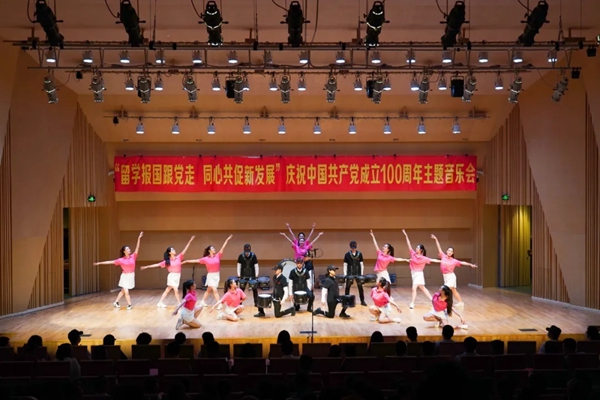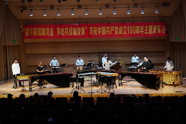 四川打击乐团学长们带来的打击乐重奏《海纳百川》、马林巴协奏曲《浪潮》以铿锵有力的节奏表达了中华民族的格局与气度,也表达了留学人员紧跟时代浪潮,助力中国梦的决心。音乐会在全场高唱《没有共产党就没有新中国》中落下帷幕,表达了留学人员庆祝中国共产党百年华诞的喜悦之情,展现了新时代留学人员积极向上、与时俱进的精神风貌。