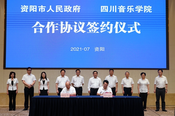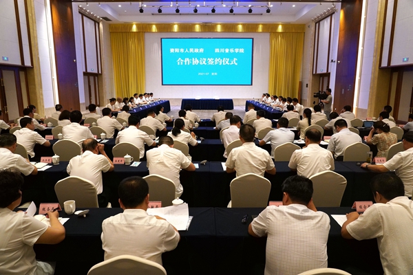 廖仁松在致辞中指出,资阳历史悠久,区位优势明显,随着天府机场的开通运营和成德眉资同城化发展战略,给资阳带来了新的发展机遇。资阳坚持把教育摆在优先发展战略位置,不断加大投入和支持力度,完善高等教育体系。此次与川音的合作,将为资阳融合文化艺术培训、美育教育培养、优秀传统文化保护提供更好的平台和支撑,也将为资阳促进文化旅游融合、文化产业、文化装备制造业、公共文化发展注入强劲动能,必将提升资阳的对外影响力和文化软实力,助推成渝地区教育事业高质量发展。川音学科优势突出,特色鲜明,国内外享有盛誉,经过80多年的发展,为国家培养了众多艺术人才,在艺术领域作出了杰出的贡献。本次合作框架协议的签署,标志着双方合作进入新的阶段,对培养特色创新人才,促进地方与高校融合发展具有非常重要的作用。希望双方聚焦战略和急需,补短板、强弱项,在人才培养、服务社会等方面发挥积极作用,为改变资阳人才结构,提升资阳人民的文化艺术修养,促进产业发展转型升级奠定良好基础。校地双方要本着务实的原则,进一步增强交流合作,积极促进协议内容落地落实,加快实现资源共享、优势互补、互利共赢。