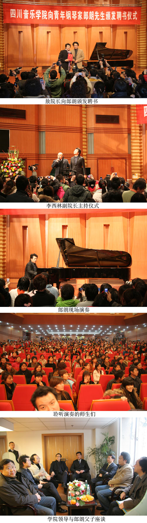 颁发聘书仪式由李西林副院长主持。院长敖昌群为郎朗先生颁发了钢琴专业名誉教授聘书,祝愿他在艺术的道路上取得更加辉煌的成绩。郎朗表示自己此次川音之行非常激动,向学院赠送了他的作品专辑《黄河之子》,并为我院师生饱含激情地演奏了《匈牙利狂想曲二》和歌剧《爱之死》的一段旋律,他精湛的演奏技巧赢得了师生们的热烈掌声。