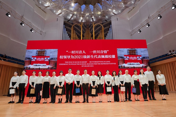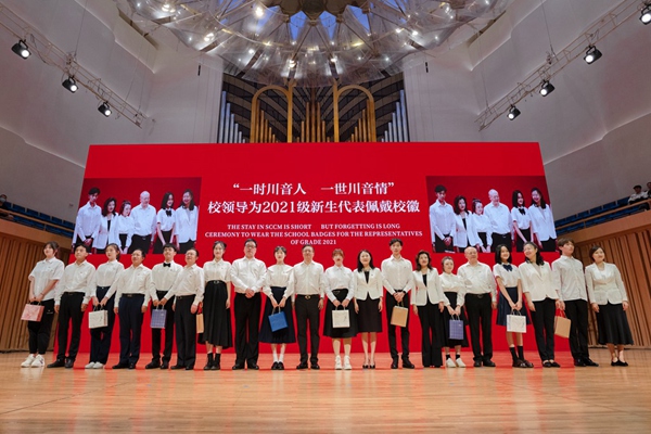 “一时川音人,一世川音情”,校领导为本部新生代表佩戴校徽,新都校区党政负责人代表为新都校区新生代表佩戴校徽。校徽承载着川音人“明德、博学、尚艺”的精神,承载着川音人的使命与荣光。从佩戴上校徽的那一刻起,新一批川音人扬帆起航,与川音同呼吸、共命运。