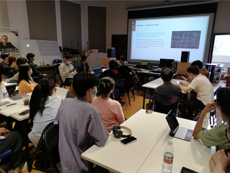 讲座共分为两个环节,第一环节景琦老师选取十六届“阳光杯”前三位获奖选手的参赛作品,以及第十七届“阳光杯”一等奖-中国选手姚雨霁的作品《Trio》作为示例,阐述了其创作思路,解析创作风格并对其音乐材料,结构等元素的逻辑关系进行分析和探讨。第二个环节则是通过“阳光杯”的整体参赛作品反应的情况以及景琦老师个人的相关工作经验,与同学们分享一些实用性的信息,为想要参加作曲比赛的同学们提供一些思路。