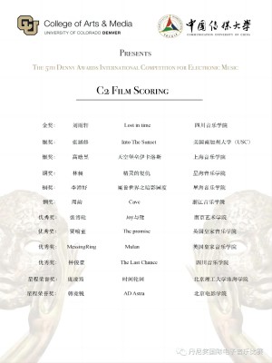 2024年1月,伟德官网作曲系本科2019级学生刘雨轩同学的配乐作品《Lost in time》在2023丹尼奖国际电子音乐比赛主竞赛单元C2「影视配乐」组获得金奖,游戏配乐作品《不夜长安》在C3「游戏配乐组」获得「铜奖」(指导老师:施子伟教授,蔡奕滨副教授)。与此同时,伟德官网作曲系2022级研究生钟俊豪同学创作的的配乐作品《The Last Chance》在2023丹尼奖国际电子音乐比赛主竞赛单元C2「影视配乐」组获得优秀奖。