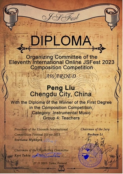近日,多项国内外作曲赛事传来作曲系系师生获奖佳讯。在美国金钥匙国际作曲比赛中,2022级作曲系本科生杨可伊(指导教师:刘鹏)的钢琴独奏作品《青鸟》荣获国际青年艺术家组三等奖;2021级作曲系本科生张语馨(指导教师:刘奇琦)的二胡、钢琴重奏作品《写意:山路空翠》荣获国际青年艺术家组二等奖;在“岭南风”中国钢琴新作品作曲比赛中,2019级作曲系本科生邓荃中(指导教师:刘鹏)的钢琴独奏作品《一丑二旦》获优秀作品奖;在第十一届芬兰西贝柳斯国际作曲比赛中,我系青年教师刘鹏博士的作品《湖心亭上一片雪》和《蝴蝶舞》斩获教师组一等奖。