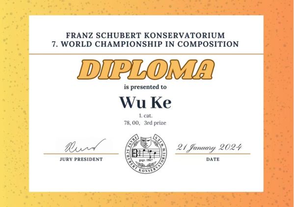 近期,在奥地利维也纳举办的第七届世界作曲锦标赛落下帷幕。此次赛事经过激烈的角逐和评委团的细致评审,作曲系2022级研究生邬可(导师:施子伟教授)所创作的室内乐作品《梦境的奇异共振》及古典吉他作品《破晓》分别荣获室内乐组二等奖(一等奖空缺)和独奏乐器组三等奖。