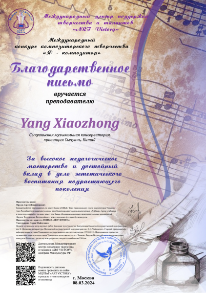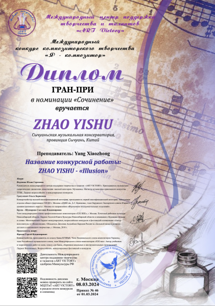 同期,赵艺姝所创作的流行音乐作品《Мелодии весны》荣获2024春之旋律国际音乐比赛特等奖(最高奖)(指导教师:杨晓忠教授)。