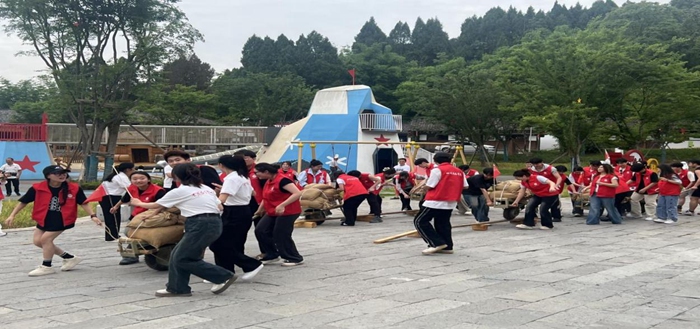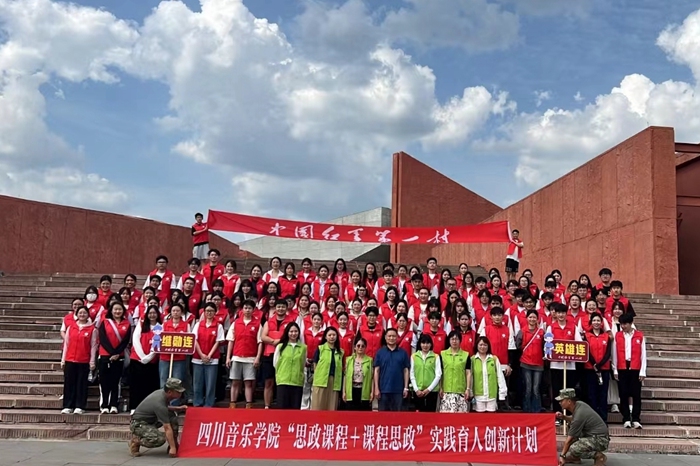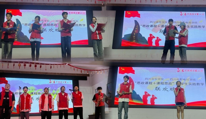 实地教学中,同学们参观了蓬溪革命烈士事迹陈列馆,在旷继勋牛角沟起义纪念碑前举行了敬献花篮仪式,深切缅怀革命先烈,体验“运送军粮,支援前线”的活动,身体力行感受长征的艰辛和不易。同学们通过观看《旷继勋蓬遂起义》《蓬溪起义》口述历史,接受红色文化教育。驻足中国工农红军四川第一路指挥部旧址,同学们感受着前辈们的风骨。两校马院教师合实践内容为同学们上了接地气的“微思政课”。联欢晚会上,两校学子将实地教学中的收获与艺术专业紧密结合,激情唱响红歌、演绎红色经典,踊跃参与历史知识竞答,现场气氛热情高涨。在结业仪式上,两校带队教师和基地负责人为获奖同学颁发证书及纪念品并合影留念。