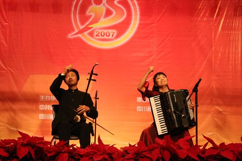 晚会在由我院易加义教授、梁云江教授、周钰教授等演奏的喜气洋洋的民乐合奏《花好月圆》、《金蛇狂舞》中拉开了帷幕;曾获第五届四川省少数民族艺术节一等奖的西南民族大学崔善子演唱的《阿里郎》、《摘苹果梨的姑娘》;绵阳市青少年宫表演的曾获全国中小学生艺术展演一等奖的精彩的现代芭蕾舞《让我们荡起双桨》;我院钢琴系讲师、俄罗斯圣彼得堡波罗底海国际手风琴比赛成人组第一名获得者夏罡表演的手风琴独奏《飘落》;曾获中国第十一届人口文化金奖的我院莉娟金蔷薇女子合唱团的女声表演唱《九寨美》;我院艺术附中表演的舞蹈《天山少女》;曾获第十一届全国青年歌手电视大奖赛团体决赛荧屏奖的我院声乐系青年教师张艳川演唱的《报答》;我院附中弦乐团演奏的弦乐合奏《探戈舞曲》;曾获2004奥地利第八届世界音乐节室内乐比赛专业组第一名的我院张晓波、梁云江教授夫妇演奏的手风琴与二胡重奏《赛马》;曾获第三届中国音乐“金钟奖”全国声乐大赛铜奖的我院青年教师唐竹雅副教授演唱的《老师,我想你》;自贡市教育艺术团为我们演唱的男女声双四重唱《祖国、我为你干杯》。