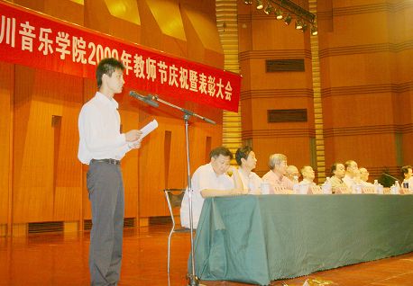 获得多项国际、国内大奖的教师代表陈军教授发言,他说,川音经过历代师生员工的多年努力奋斗,取得了包括评建工作获得优秀学校和重大科技奖在内的丰硕成果。现在又站在了新的台阶,提出了新的奋斗目标,作为教师,我们感到非常自豪。在未来的工作中,将在科学发展观的指导下,精于务教,努力培养更多更好的艺术人才,为学院的发展,为祖国的教育事业作出更大的贡献。