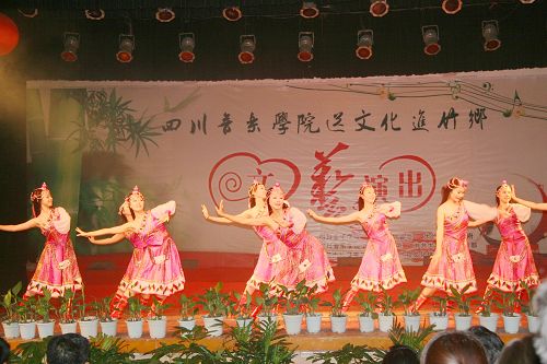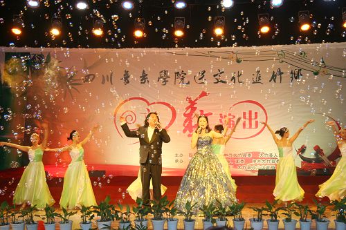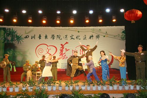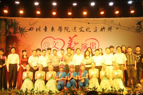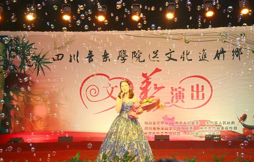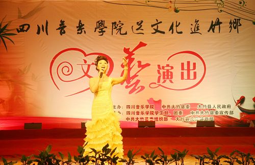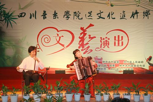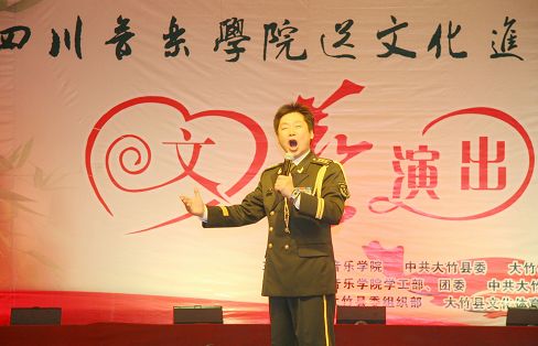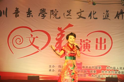 文艺演出在大竹县文化馆带来的极具地方特色的竹乐器合奏《竹乡春早》中拉开帷幕。中国第七届“荷花杯”民族民间舞蹈大赛创作铜奖获得者、由李健子老师指导的川音舞团表演欢快的舞蹈《溜溜姑娘》、《洗衣舞》、《莎朗姐》,第十三届青年歌手电视大奖赛流行组四川赛区金奖获得者王利演唱《好运来》、《江山》,2010年第14届CCTV青年歌手电视大赛河南赛区一等奖获得者张宇演唱《龙文》、《青春舞曲》,全国第一个手风琴硕士、我院钢琴系手风琴教授张晓波演奏《我为祖国守大桥》,第十一届全国青年歌手电视大奖赛四川赛区通俗唱法金奖获得者王晓晓演唱《美丽的草原我的家》、《垄上行》,第十三届全国青年电视歌手大赛银屏奖、四川赛区金奖获得者张艳川演唱《芦花》、《载歌载舞》,第七届中国音乐“金钟奖”笛子专业全国十强获得者、青年笛子演奏家石磊演奏《牧民新歌》,文化部首届流行音乐大赛唯一观众最喜爱歌手奖获得者张文博演唱《红旗飘飘》、《精忠报国》,四川省二胡协会会长、我院民乐系副系主任梁云江教授和张晓波教授合奏《赛马》,第十六届“长江杯”国际声乐比赛银奖获得者童韬演唱《跟我走》,西部歌手大赛银奖获得者杨婉琴副教授演唱《节日欢歌》,中国音乐最高奖金钟奖获得者谭学胜副教授演唱《天路》、《中华情》,童韬、杨婉琴副教授演唱《为祖国干杯》,大竹县艺术团带来的川剧小品《傻儿将军回乡》更是把晚会推向了高潮。异彩纷呈的文艺节目,让观众们开阔了眼界,艺术家们高水准的演出赢得了现场观众热烈的掌声。