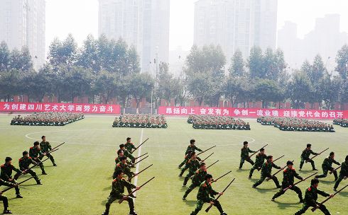 军训学子举行了女子匕手操、徒手操、女子擒敌术、男子格斗术、短棍术、女子啦啦操汇报表演。军训场上,又一次展示出川音学子的昂扬向上的精神风貌和良好的综合素质。口号声、脚步声响彻云霄。