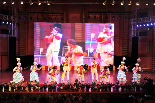 文化部原代部长、中国文联终身名誉主席、我国著名词作家、音乐家、艺术科学家周巍峙,组委会秘书长、文化部文化科技司副司长王丰,组委会副秘书长、文化部文化科技司教育处处长刘玉普,组委会委员、文化部教育司教育处副处长何亚文,文化部民族民间文艺发展中心主任李松,副主任张刚,中国艺术研究院研究员、南京艺术学院名誉教授伍国栋,四川省教育厅副厅长王康,四川省文化厅副厅长李兆权,西南民族大学艺术学院副院长土登,四川艺术职业学院党委书记朱贵庆,我院领导以及新闻媒体参加了颁奖晚会。