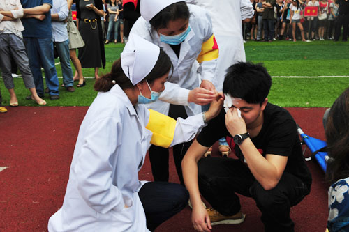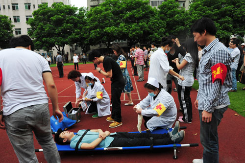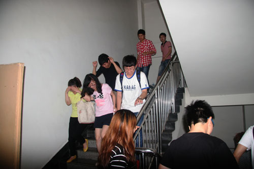 此次演习主要针对突发地震灾害,实施在校人员紧急避险疏散。地震发生后,学院领导指挥小组、灭火小组、搜救小组、预警广播组、楼层疏散引导组、医疗救治组、后勤保障组等迅速按应急预案,进入现场展开紧张的工作。全校师生员工首先在教室、办公楼进行避震。待地震停止后, 2:12分全校师生员工全部到达足球场等指定避险开阔地带。医疗救治组、后勤保障组对伤员进行现场紧急救治。演习中,全院师生相互帮助,快速有序。按照学院进行的逃生教育、选择正确的路线、采取科学的方式进行逃生自救,确保生命财产安全。